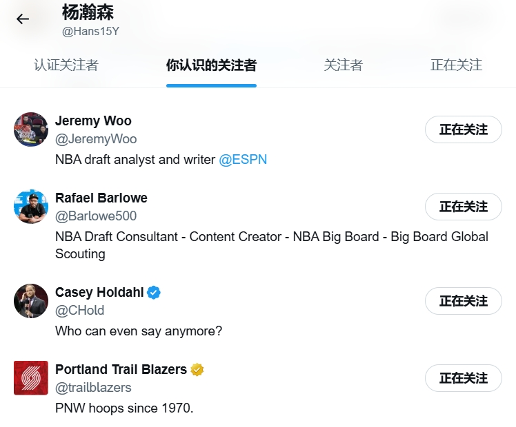 该账号的被关注列表中,已经有多位开拓者跟队记者和开拓者官推在列。