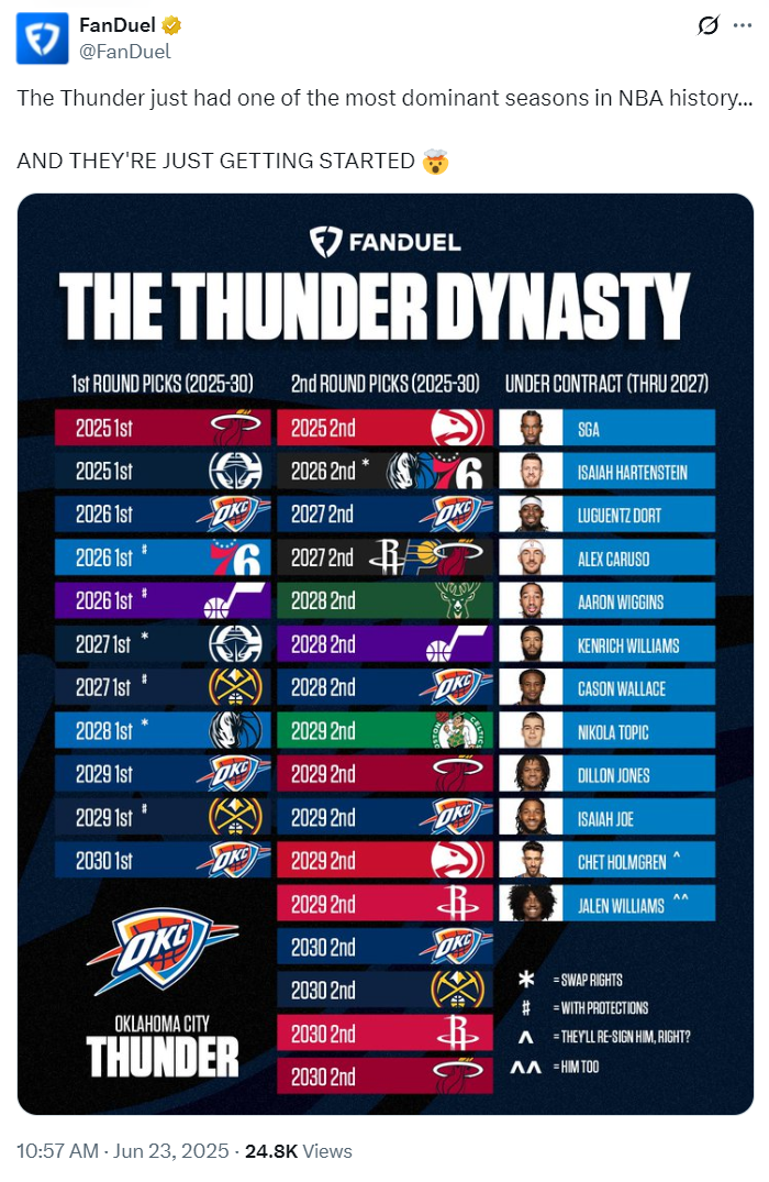 正如我说的这支雷霆夺冠只是一个开始,他们下赛季阵容名单12人合同要到2027年才到期,25-26赛季15人都还身背合同,除此之外未来五年他们有11个首轮签(4个保护+2个互换)与16个次轮签,这支小球市球队会成为很多豪门的噩梦。